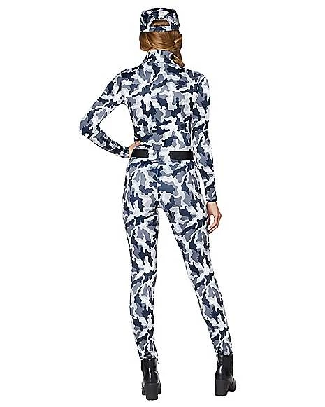 Atten-Hut! Show your patriotism on Halloween with this snow camo catsuit! This military costume comes complete with a matching hat, dog tags, and a removable belt, leaving you with a look that is out of this world! This stylish costume will have everyone standing at attention when you walk into the party.