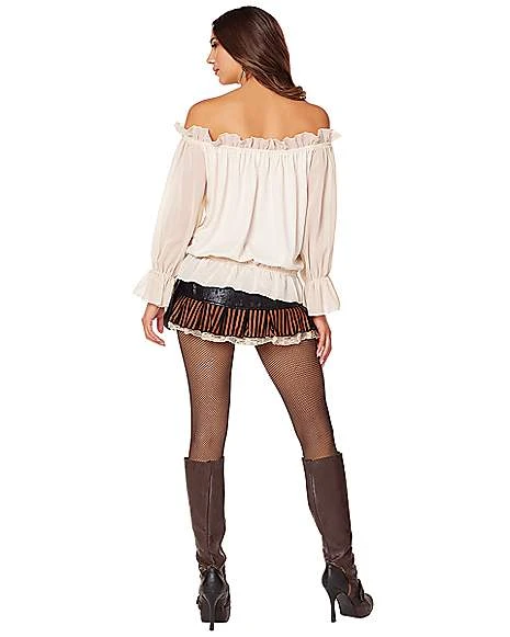 White Peasant Top makes a stylish addition to any costume or outfit. Shirt cinches at the shoulders, waist and wrists for an extra ruffled bohemian effect.