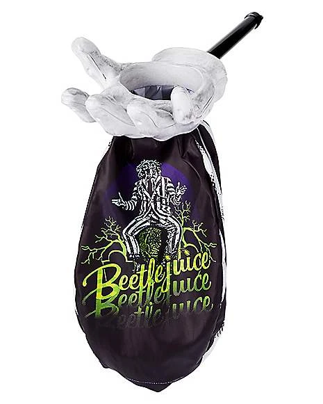 Collect your candy this Halloween with a hand from your favorite character when you use this Beetlejuice Loot and Scoop Treat Bag. This black and white striped loot bag will always give you some Beetlejuice vibes and is perfect for gathering lots and lots of candy this Halloween.Â