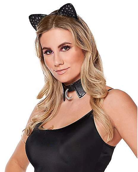 Let your inner black cat shine with this celestial cat costume kit! This pretty kitty kit includes a black headband with attached star-covered ears, a clip-on tail, and a choker necklace with a stunning moon charm.