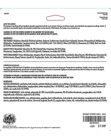 Drift through haunted houses as a ghoulish spirit this Halloween with the aid of this Ghost Stories Makeup Kit. This complete professional set includes a rich white cream base, a 5-color (black, 2 shades of grey, burgundy, and ivory) palette, black eyeliner, a double tip, and 2 sponge applicators. Experiment to create the ideal ghost, zombie, vampire, or other undead look to spook your friends!