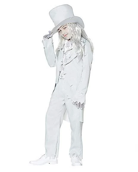 From Our Exclusive Signature Collection. Your child will be the most courteous ghost in the graveyard when he dons this Ghostly Gent costume! This ghoulish costume features an intentionally tattered coat with matching pants, along with a soft velvet-like vest. This ghostly attire has a formal appeal that will have your child dancing on the abandoned dancefloor all night long. Whether he’s taking a stroll through a graveyard or wandering the halls of a haunted home, your little Ghostly Gent is sure to have a memorable Halloween.