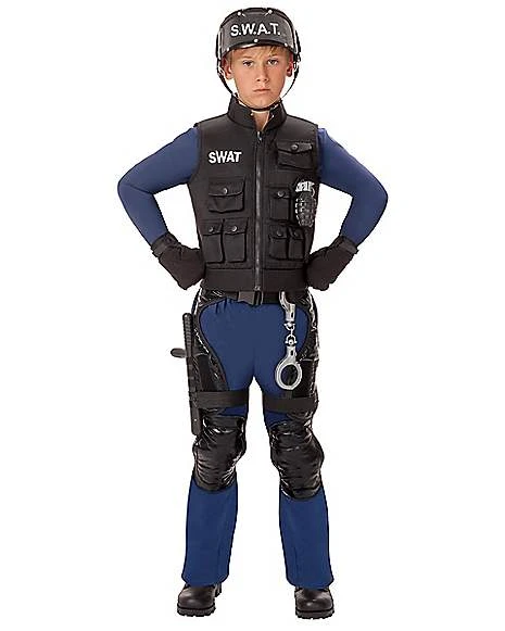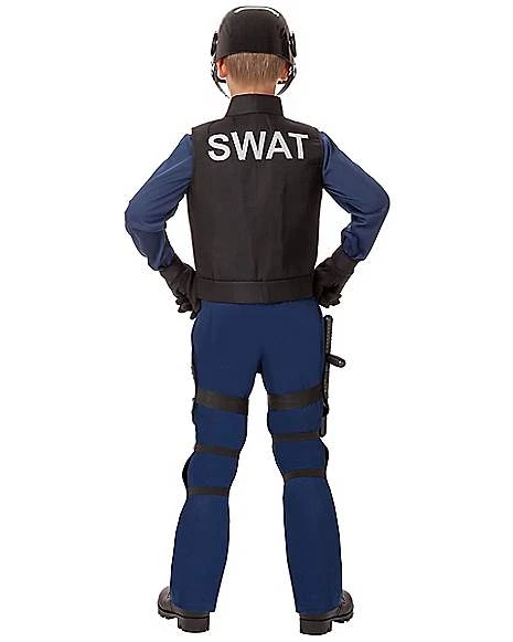 From Our Exclusive Signature Collection. Have your child be prepared for anything when they dress up in this deluxe SWAT costume. Including everything they need to be a member of a SWAT unit, this costume features a high-quality black vest, which accents the dark blue shirt and pants underneath. Whether you’re taking them trick or treating, or just going to an awesome costume party, your child is sure to love this unique occupational costume!
