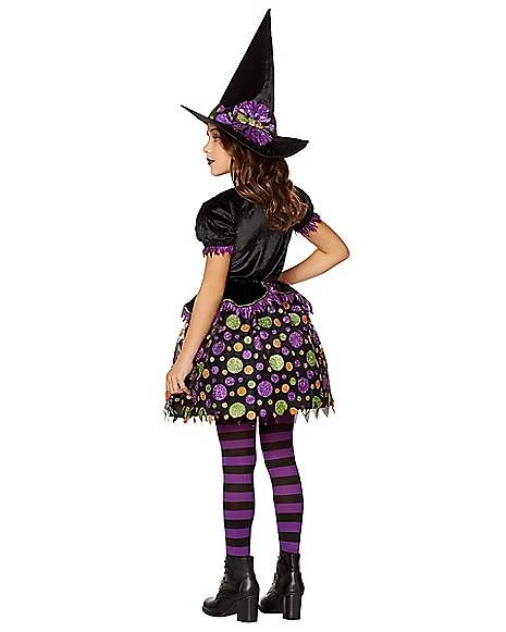 There’s nothing scary about this whimsical witch costume! With polka dot glitter detail, this adorable dress will have your little one shining all night long! The matching witch hat has a bendable brim, so you can create the perfect look for Halloween night. Slip into the included striped stockings and you’ll be ready for a night of whimsical fun!