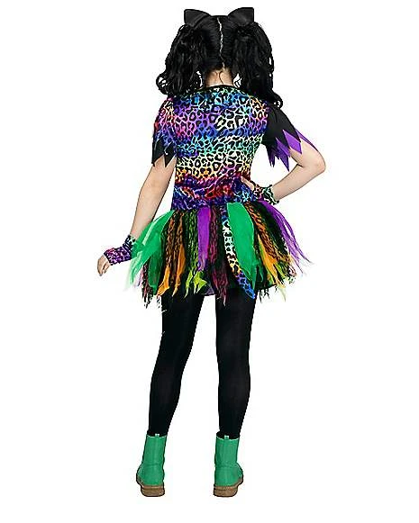 Bring out the claws this Halloween with style when you dress up in this Kids Wild Rainbow Cat Costume. This colorful costume is the perfect match for your feisty personality featuring a leopard print rainbow dress, glovettes, tights, and a rainbow cat ears headband. There’s no better way to show off your wild side this Halloween than with this colorful cat costume.Â