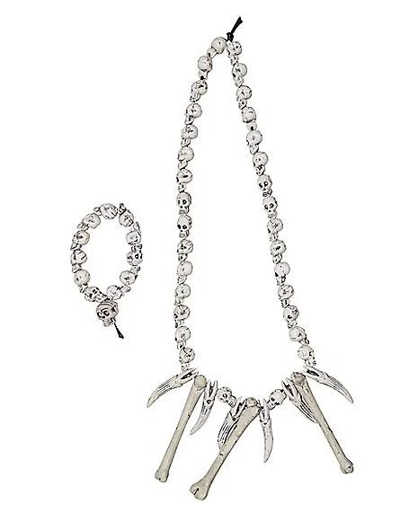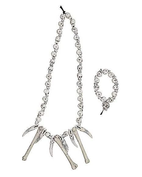 Add a haunting look to almost any costume when you accessorize with this skeletal jewelry! Both the necklace and bracelet feature small skull beads, and the necklace also has different bone charms hanging off it, making this the perfect accessory set for almost any dark costume.
