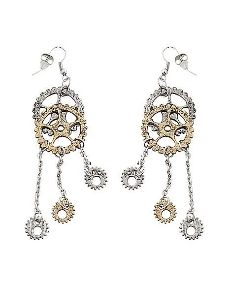 Get ready for a Steampunk convention with these Steampunk Gear Earrings! These gold and metal colored earrings feature two large overlapping gears with three smaller ones dangling off of them. These aesthetically designed earrings inspired by the industrial period will be the perfect addition to your Steampunk attire!
