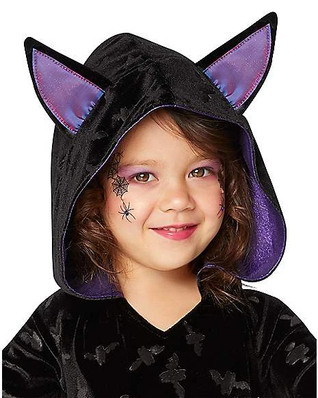 Go batty this Halloween in this hooded bat dress! This beautiful bat dress features an attached hood with bat ears. A hint of shimmer lines the inner ears and skirt, while rich bat-print velvet adorns the bodice. A dainty bow sits at the waist, serving as a darling reminder that bats can be adorable.