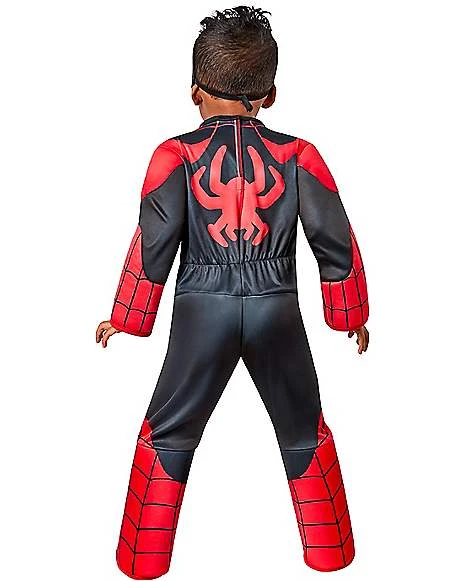 Spin a web of action in this officially licensed Toddler Miles Morales Costume! Spidey and His Amazing Friends must come together to fight. As a team, they are unstoppable. This red and black costume includes chest and shoulder pads that will make you look like you have super strength! Boot toppers and a fabric mask will transform you into an instant hero.