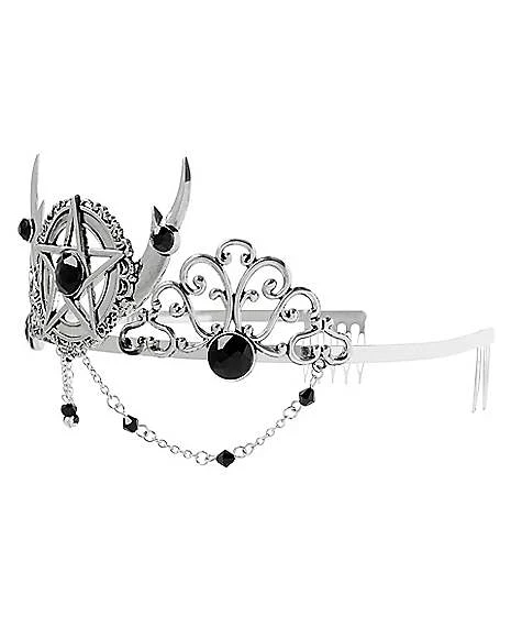All hail the witch queen! This Witch Pentagram Tiara is altogether elegant and eerie. Featuring a silver and black gem-effect pentagram charm and flattering chains, this comb tiara will make your witch costume stand out in a sea of pointy, black hats!