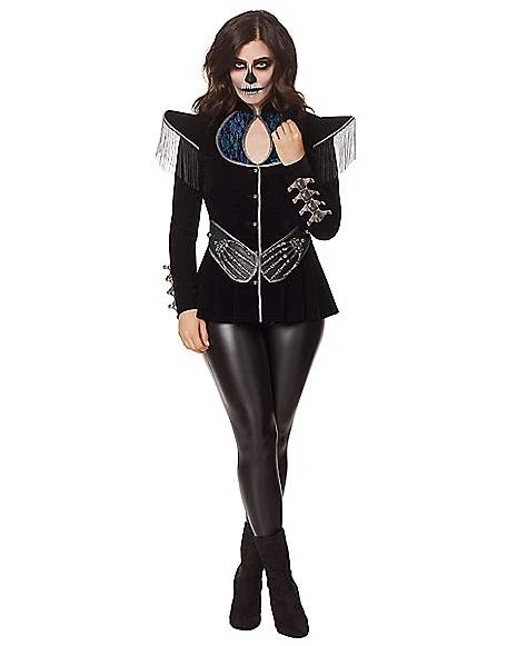 Get ready for applause when you enter any costume party in this Women’s Skeleton Royalty Jacket. With its skeleton hands in front, fringe on the shoulders and lace detail on the back, you’ll be wearing the ultimate spooky chic on Halloween.